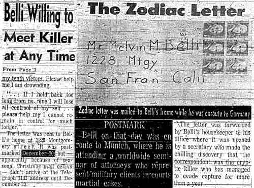 - The real Zodiac mailed a letter to Belli’s home on December 20, 1969, the day that Belli departed for Europe.