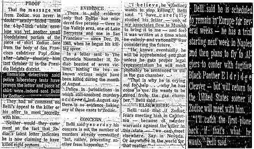 Paul Avery, reporter for the San Francisco Chronicle contacted Melvin Belli by phone in Munich, Germany on December 28. Belli commented on the Zodiac letter and offered his help to the Zodiac. Avery’s article (see photos below) appeared in The San Francisco Chronicle on December 29, 1969, and specifically stated that Belli was “en route to Germany” on the day the letter had been postmarked – December 20, 1969. Avery also mentioned that the housekeeper had forwarded the letter. Belli described his travel plans to Avery, who wrote, “Belli said he is scheduled to remain in Europe for several weeks – he has a trial starting next week in Naples, and then plans to fly to Algiers (Africa) to confer with fugitive Black Panther Eldridge Cleaver …”
