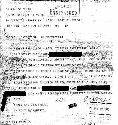 1 14 70 RE: SAN FRANCISCO AIRTEL DECEMBER TWENTY NINE LAST. On instant date Insp. (name redacted), Homicide Detail, San Francisco Police Department, confidentially advised that UNSUB, who identified himself as ‘Zodiac,' telephonically contacted attorney Melvin Belli's residence in effort to contact Belli. UNSUB was advised Belli was in Europe and stated, ‘I can't wait. Today's my birthday.'