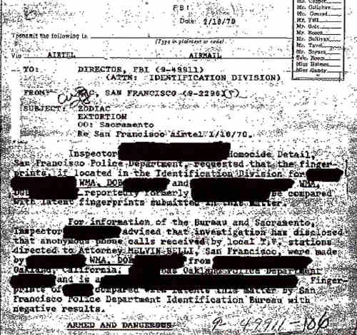 FBI files indicate that police were quick to report developments to the FBI. The SFPD sent dozens of requests to the FBI for assistance in the investigation, including fingerprint and handwriting comparisons, checks for criminal records, identifications of suspects, suspect information, examination of coded messages, and more, including simple memos to correct the spelling of a suspect’s name. In one instance, police requested copies of the fingerprints belonging to a potential suspect and arranged with the FBI for the evidence to be flown from Washington to California on the same day the request was submitted.